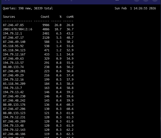 r(Response Code): Виждаш дали има много грешки (NXDOMAIN,SERVFAIL). АкоSERVFAILе висок процент, имаш проблем с forwarders или мрежата.